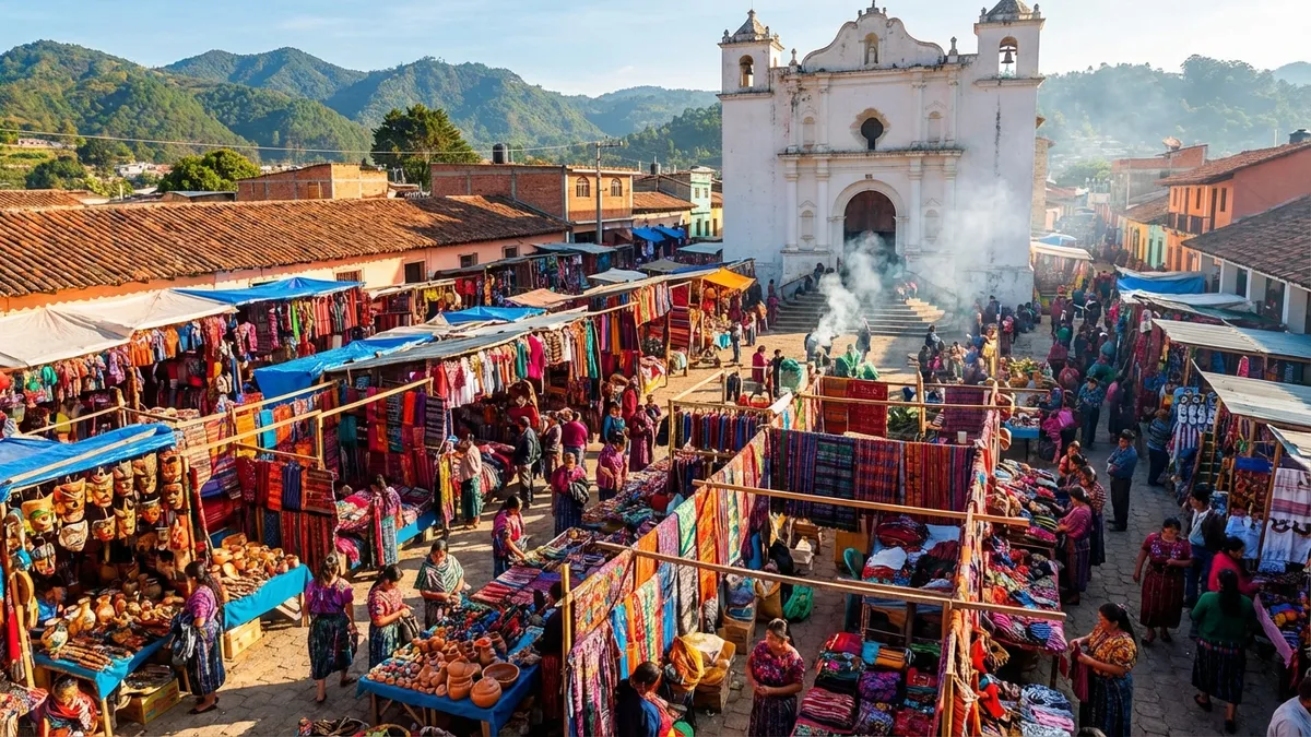 Twice a week, the highland town of Chichicastenango transforms into a kaleidoscope of color, sound, and living Maya tradition. Vendors drape hand-woven textiles across wooden stalls. Incense spirals up the steps of a colonial church where shamans conduct ancient ceremonies alongside Catholic priests. Thousands of buyers and sellers crowd narrow streets, haggling over jade carvings, hand-embroidered blouses, painted masks, and fresh produce. This is Chichicastenango market — one of the most extraordinary indigenous markets in the Western Hemisphere.